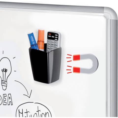Progettato ingegnosamente questo portapenne magnetico permette di avere sempre a portata di mano pennarelli e piccoli accessori. Capacità: 10 pennarelli per lavagna. Realizzato in polistirene antiurto riciclabile. Dim. 78 x 74 x H.95 mm.