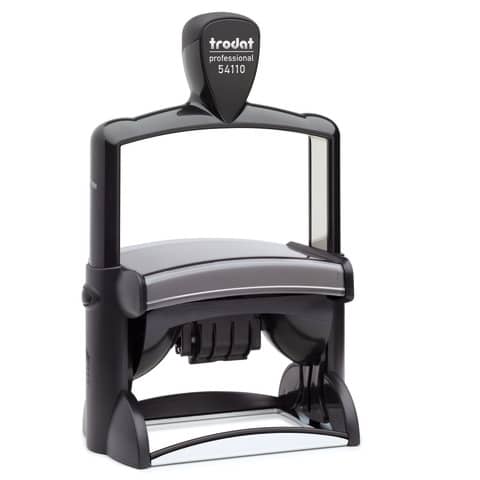 Timbro datario personalizzato TRODAT PROFESSIONAL 54110 - 85 x 44 mm - altezza caratteri data: 4 mm - fino a 6+6 righe. Personalizzazione dell?impronta disponibile nei colori NERO, BLU, VERDE, ROSSO. Struttura interna in acciaio. Impugnatura ergonomica per uso professionale. Massima qualità delle impronte. Inchiostro indelebile in conformità alla norma DIN ISO 14145-2. Modello cartuccia di ricambio Trodat 6/511. Sostituzione della cartuccia semplice e pulita. Regolazione pulita della data grazie alla copertura delle bande. Validità datario 12 anni. Semplice posizionamento dell'impronta. Prodotto eco sostenibile.
