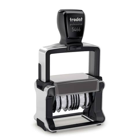 Timbro doppio datario personalizzato TRODAT PROFESSIONAL 5466 4.0/PL - doppia data - 56 x 33 mm - altezza caratteri data: 4 mm - fino a 3+3 righe. Personalizzazione dell?impronta disponibile nei colori NERO, BLU, VERDE, ROSSO. Solida struttura in acciaio INOX. Impugnatura ergonomica per uso professionale. Massima qualità delle impronte. Inchiostro indelebile in conformità alla norma DIN ISO 14145-2. Modello cartuccia di ricambio Trodat 6/56. Sostituzione della cartuccia più semplice e pulita. Regolazione pulita della data grazie alla copertura delle bande. Validità datario 12 anni. Semplice posizionamento dell'impronta. Prodotto eco sostenibile.
