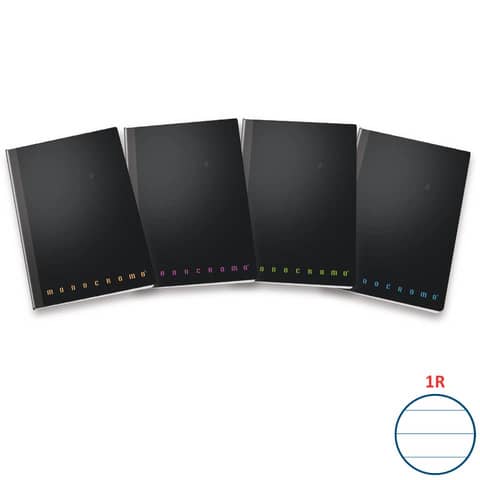 Maxi Filo Singer formato 22x28 cm - Fogli 60+2, carta interna da 80 gr, cover nera in PPL con scritta ''Monocromo'' in 4 colori fluo assortiti (arancione, blu, rosa, verde). Rilegatura filo singer. Prodotto certificato FSC. Rigatura 1R.