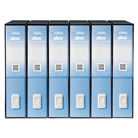 Il registratore a leva Dox 2 è rivestito con carta goffrata antimpronta e rifinito con paralati metallici alla base della plancia. E` dotato di un meccanismo a leva in acciaio nichelato con pressino, linguella di estrazione a scomparsa e portaetichette con etichetta reversibile. La custodia è rivestita con carta nera goffrata trattata antimpronta con interno nero. Ogni dox possiede al suo interno un volantino con il codice QR da applicare sull' etichetta e 3 semplici indicazioni per come scaricare la app su App Store e Google play Dorso: 8 cm. Modello: Protocollo. Colore: azzurro.