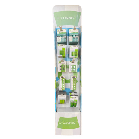 Resta sempre in carica con l’espositore da terra di batterie in blister Q-Connect! Batterie alcaline, al litio e ricaricabili per dare tutta l’energia necessaria! 84 confezioni di prodotti blisterati tutti pronti da esporre. Contenuto del display nel dettaglio: 40 batterie alcaline AA/LR6 (10 conf. da 4 pz); 40 batterie alcaline AAA/LR03 (10 conf. da 4 pz); 10 batterie alcaline C/LR14 (5 conf. da 2 pz); 10 batterie alcaline D/LR20 (5 conf. da 2 pz); 48 batterie al litio a bottone CR2025 (12 conf. da 4 pz); 48 batterie al litio a bottone CR2032 (12 conf. da 4 pz); 100 batterie alcaline a bottone LR54 (10 conf. da 10 pz); 100 batterie alcaline a bottone LR44 (10 conf. da 10 pz); 20 batterie ricaricabili AA (5 conf. da 4 pz) e 20 batterie ricaricabili AAA (5 conf. da 4 pz).