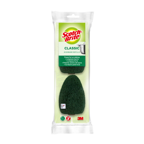 Scotch-Brite? refill Classic per bacchetta confezione da 2 pezzi. Scotch-Brite? DISHWAND, è un nuovo strumento di pulizia formato dalla combinazione di una spugna applicata ad una bacchetta dispenser di detersivo, che permette di pulire un?ampia varietà di superfici. La spugna è disponibile in versione Classic Heavy-Duty o Delicate. La fibra è costituita al 100% di contenuto riciclato. Dimensioni: 223 x 88 x 41 mm.