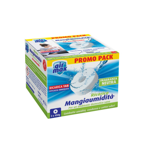 Ricarica Tab Air Max 2x450gr neutra. La Ricarica Tab è la tecnologia più avanzata nell?ambito dei cristalli assorbiumidità. È composta da cristalli compressi che si attivano più rapidamente rispetto alle altre ricariche: le prime gocce sono visibili già dopo 24 ore. Garantisce un utilizzo pulito e sicuro. Utilizzabile negli apparecchi deumidificatori Air Max 450g, disponibile in formato da 2 o da 4 Tab nelle fragranze neutra e lavanda. Effetto potente. Assorbimento ottimale dell?umidità. Pulito, sicuro e igienico. Disponibile neutro o con fragranza profumata. Durata: 450g lavorano per circa 3 mesi in una stanza fino a circa 50 m³ e assorbono circa 0.6L di acqua, in base alla temperatura, all?umidità presente nell'aria e alle dimensioni del locale. Modalità di utilizzo: Tagliare e aprire la confezione contenente la pastiglia. Sollevare il tappo dal dispositivo e inserire la pastiglia senza imballaggio nell?apposito vano. Ricollocare in posizione il tappo del dispositivo. Una volta che la pastiglia si è dissolta completamente, il dispositivo può essere svuotato facilmente. Macchie e residui: Le perdite accidentali di fluido possono causare macchie superficiali. In caso di perdite di fluido, lavare immediatamente con acqua abbondante, quindi tamponare ripetutamente finché la superficie non è asciutta. Evitare il contatto con cuoio, legno, pietra e metallo, poiché questi materiali possono subire alterazioni.