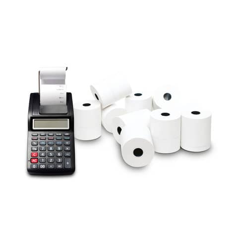 Rotoli Exclusive in carta termica da 55 grammi per calcolatrici e POS disponibili nella gamma completa dei formati utilizzati da tutti i terminali per il pagamento online. Rotoli con anima.