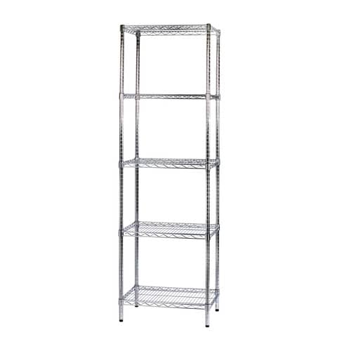Scaffale in filo d'acciaio cromato completo di guancette per il fissaggio dei ripiani all'altezza desiderata. Tubolari con tappo superiore nero e piedini regolabili. Portata massima ripiani 100 kg. Spessore filo mm 6/4/3/GAP 20. Diametro tubolari 2,54cm. Dimensioni: L.60 x P.45 x H.200 cm. 5 ripiani. Colore acciaio cromato.