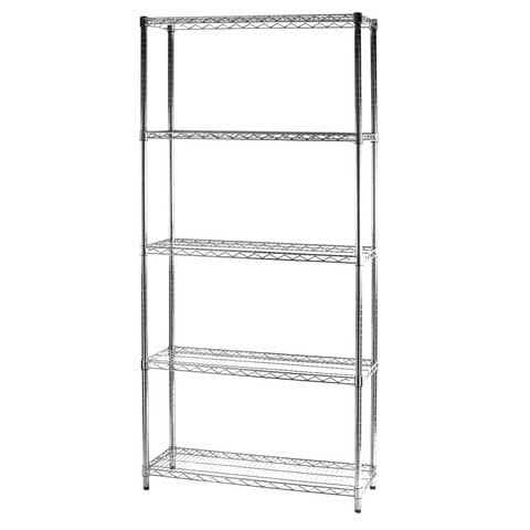 Scaffale in filo d'acciaio cromato completo di guancette per il fissaggio dei ripiani all'altezza desiderata. Tubolari con tappo superiore nero e piedini regolabili. Portata massima ripiani 100 kg. Spessore filo mm 6/4/3/GAP 20. Diametro tubolari 2,54cm. Dimensioni: L.90 x P.35 x H.200 cm. 5 ripiani. Colore acciaio cromato.
