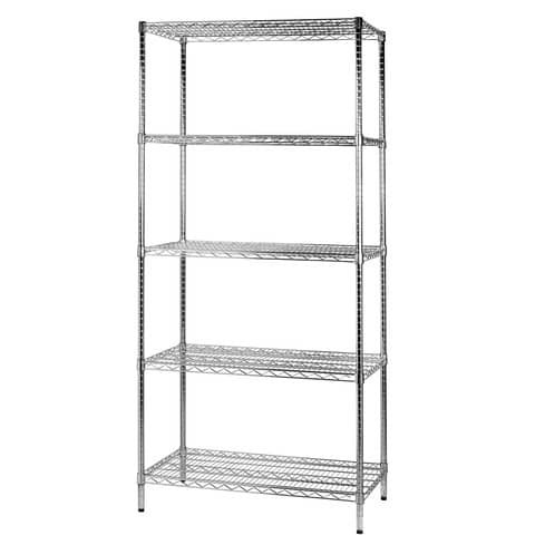 Scaffale in filo d'acciaio cromato completo di guancette per il fissaggio dei ripiani all'altezza desiderata. Tubolari con tappo superiore nero e piedini regolabili. Portata massima ripiani 100 kg. Spessore filo mm 6/4/3/GAP 20. Diametro tubolari 2,54cm. Dimensioni: L.90 x P.60 x H.200 cm. 5 ripiani. Colore acciaio cromato.
