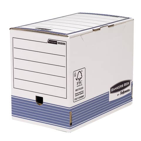 Scatola archivio formato A4 ad assemblaggio automatico Fastfold? con linguetta di chiusura per una maggiore sicurezza. Compatibile con scatole e contenitori archivio della linea System. Realizzato in cartone 100% riciclato certificato FSC®. Dorso 20 cm.