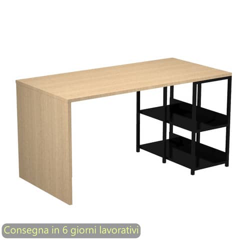 Scrivania compatta composta da un piano che poggia da un lato su un resistente fianco in legno e dall'altro su una pratica libreria in metallo. Il design moderno composto dall'accostamento del metallo al legno, di influenza scandinava, e la compattezza della postazione la rendono ideale per lo Smart Working e l'Home Office. Dimensioni L. 140 x P. 69 x H. 72,4 cm. Piano sp. 22 mm in melaminico, con bordo in spessore ABS antiurto e privo di spigoli vivi. Fianchi melaminico sempre di spessore 22 mm. Struttura della libreria in metallo verniciato nero opaco dotato di due ripiani e piedini regolabili. Profili 20 x 20 mm. Imballo in cartone riciclato a tutela dell' ambiente. Produzione certificata conforme alle procedure UNI EN ISO 9001. Certificazioni FSC e PEFC. Colore delle finiture del piano e fianco in legno rovere.