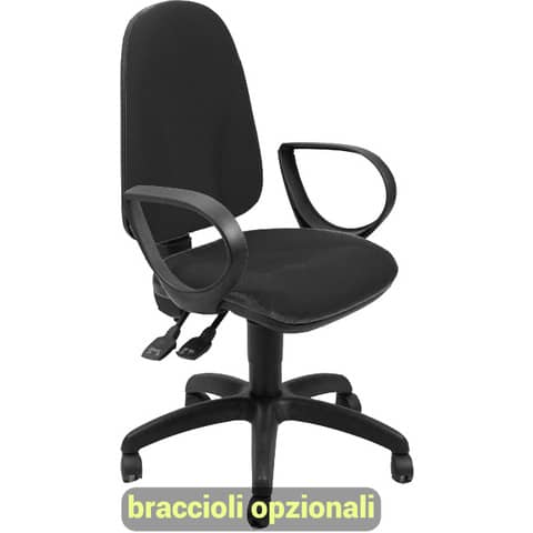 Struttura in acciaio nero, guscio inferiore e dorsale in PPL nero, base in Nylon. Rivestimento del sedile e dello schienale in tessuto Eco, 100% Polipropilene 380g m/l, di colore nero. Con ruote, braccioli opzionali (codice 110075).