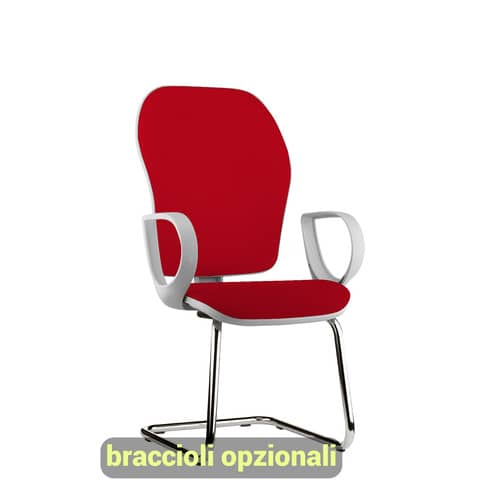 Struttura e base in acciaio cromo, schienale in rete nero. Rivestimento del sedile in tessuto ignifugo Classe No Flame, fibra modacrilica, reazione al fuoco classe 1 ? 380g m/lin di colore rosso. Braccioli opzionali.