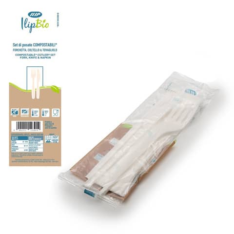 Set di 2 posate coltello + forchetta con tovagliolo 2 veli. Materiale PLA BIO. Colore bianco. In confezione da 250 set. Prodotto idoneo a contenere bevande alimentari a base acquosa, acida ed alcolica a temperatura ambiente o inferiore per periodi di tempo prolungati e alla temperatura massima di 70°C per tempi inferiori a 2 h. Non utilizzare in forno o forno a microonde. Normative di riferimento 1935/2004/CE; D.M. 21/03/1973 e successivi aggiornamenti; Regolamento 10/2011/UE e successivi aggiornamenti; Direttiva 94/62/CE e successivi aggiornamenti; UNI EN 13432:2002.