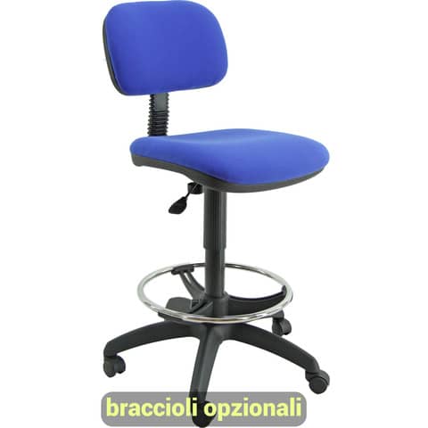 Seduta e schienale rivestiti in tessuto Eco, 100% Polipropilene 380g m/l, di colore blu. Con ruote, braccioli opzionali (codici 110074, 110075).