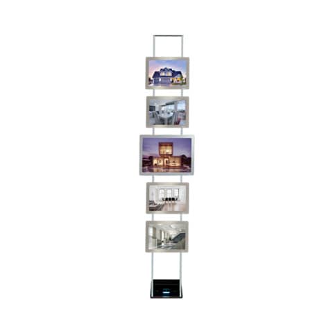 Elegante struttura autoportante in acciaio cromato con 4 cornici magnetiche A4 e 1 cornice A3 retroilluminate a led. Il concetto che contraddistingue questo prodotto è la libertà da ogni tipo di installazione a muro, con cavi o su binari. Per effetto di magneti sul retro, la cornice, calamitata alla struttura, si accende istantaneamente. Le cornici possono essere posizionate sulla struttura sia verticalmente che orizzontalmente su entrambi i lati della struttura per aumentare il numero dei messaggi esposti. Le immagini da inserire all?interno delle cornici sono facilmente sostituibili rimuovendo e riposizionando l?accessorio magnetico in dotazione. Struttura in acciaio cromato Easy LEDMAG 25x40x200 cm. Cornice magnetica LEDMAG formato A4 orizzontale/verticale 34x25 cm. Formato A3 orizzontale/verticale 34x47 cm. Trasformatore da 50w 24v.