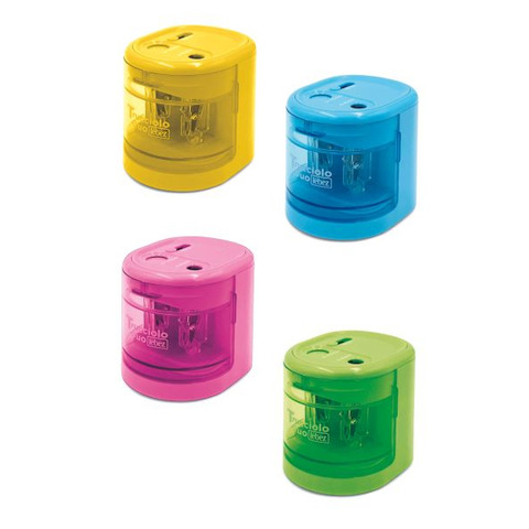 Temperamatite da tavolo a 2 fori da tavolo a batteria con serbatoio. Ideale per matite fino a 12 mm di diametro. Temperino sostituibile. Scatola appendibile. Batterie AA x4 (non incluse). Colori assortiti.