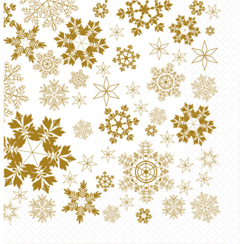 Tovaglioli realizzati in pura cellulosa a 3 veli. Dimensioni: 33 x 33 cm. Hanno una decorazione a tema natalizio ''Gold Ice'': fiocchi di neve dorati. Sono idonei al contatto alimentare esclusivamente dalla parte non decorata. Ideali da utilizzare durante feste oppure eventi. Confezione composta da 20 tovaglioli.