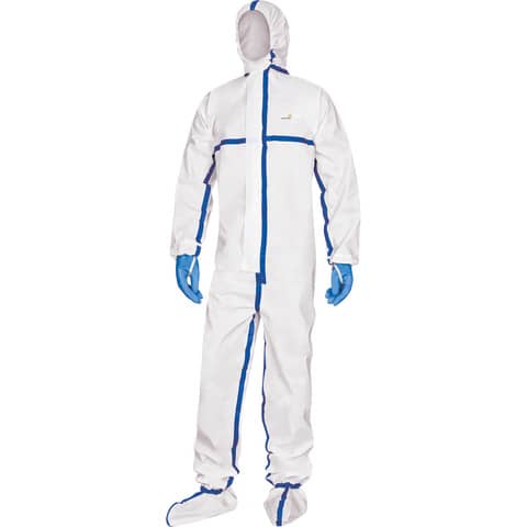 Tuta integrale monouso con piedi antiscivolo integrati e cappuccio elasticizzato. Tipo 4-B. PE/PP non tessuto. Chiusura con zip sotto baverina. Elastico di chiusura in testa, in vita, ai polsi ed alle caviglie. Monouso. Cuciture impermeabili. Lavori di decontaminazione. Chiusura con mentoniera. Ottimo supporto e protezione rinforzata. Doppio foro per il pollice. Ottimo supporto. Banda adesiva per il collegamento di un guanto. Impermeabilizzazione totale. Nessun rischio di formazione di pelucchi. Imballo individuale sottovuoto. Certificazione CE. REGOLAMENTO (UE) 2016/425. EN ISO 13688:2013 Requisiti generali per i capi di abbiglliamento. EN14605:2005+A1:2009 Requisiti prestazionali per indumenti con collegamenti a tenuta contro liquidi (Tipo 3) o spruzzi (Tipo 4). TIPO 4B: Protezione contro i prodotti chimici liquidi (nebbie) - Tipo 4B. EN ISO 13982-1:2004+A1:2010 Indumenti di protezione per l'utilizzo contro particelle solide - Indumenti tipo 5. TIPO 5B: Protezione contro le polveri (amianto) + protezione biologica Tipo 5B. EN13034:2005+A1:2009 Requisiti prestazionali per indumenti di protezione chimica che offrono una protezione limitata contro agenti chimici liquidi (equipaggiamento tipo 6). TIPO 6B: Protezione limitata contro prodotti chimici liquidi + protezione biologica Tipo 6B. EN14126:2003+AC:2004 Indumenti di protezione - Requisiti prestazionali e metodi di prova per gli indumenti di protezione contro gli agenti infettivi. Colore bianco. Taglia XXL.