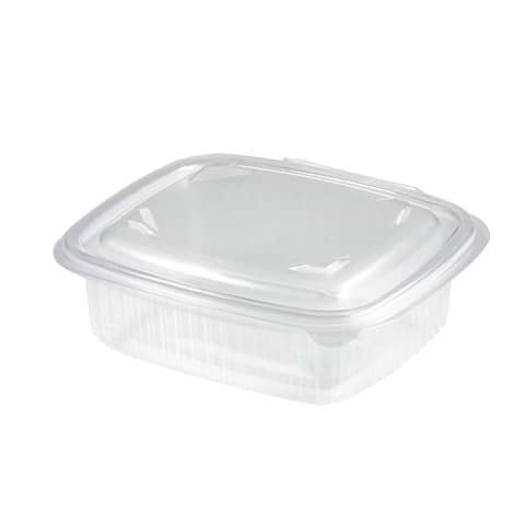 Vaschette realizzate in polipropilene con coperchio incernierato trasparente. Altezza: 51 mm. Adatte al contatto con alimenti: fino a una temperatura massima di 90 °C per 15 minuti. Utilizzabili in microonde fino a 500 Watt per 2 minuti. No grill. Capienza: 250 ml. Confezione composta da 50 pezzi.