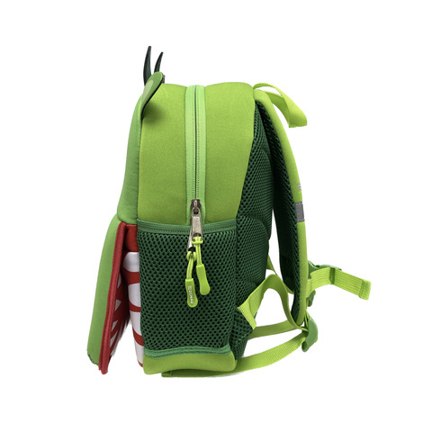Zaino dalla simpatica forma a dinosauro. Composizione: tasca frontale pieghevole con scomparto a cerniera nascosta, scomparto principale con cerniera interna separata e porta nome/indirizzo, schiena imbottita e tracolle, striscia riflettente, 2 scomparti laterali e cintura toracica. Materiale esterno neoprene, fodera interna in poliestere. Dimensioni: 30 x 10 x 25 cm. Capienza di circa 7,5 L.